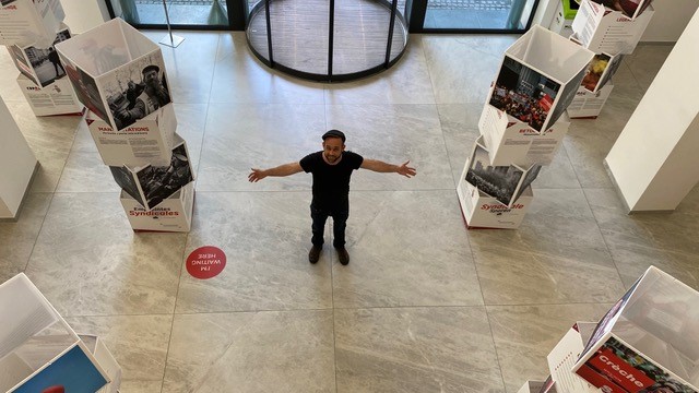 De tentoonstelling "Syndicale Sporen" van CEPAG BXL is een collectie van 96 foto’s op 12 zuilen van fotograaf/videast Cyprien Lepoivre.